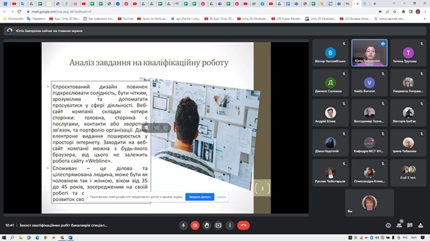 В 2025 рік, захист кваліфікаційних робіт першого (бакалаврського) рівня вищої освіти. До наказу про допуск до дипломування включено 95 здобувачів денної форми навчання, 10 здобувачів групи прискореної форми навчання ВПВПСу-22-1 та 11 здобувачів заочної форми навчання, разом – 116 бакалаврів. Дуже напружений графік захистів, працювали дві комісії на чолі з головами ЕК – професором кафедри Мультимедійних систем і технологій, ХНЕУ ім. С. Кузнеця, д.е.н. Людмилою Володимирівною Потрашковою та директором ТОВ «Бурунін і К» Василем Олександровичем Буруніним. Всі здобувачі успішно захистили кваліфікаційні роботи: 31,6% на відмінно, 52,7% на добре, 15,7% на задовільно.