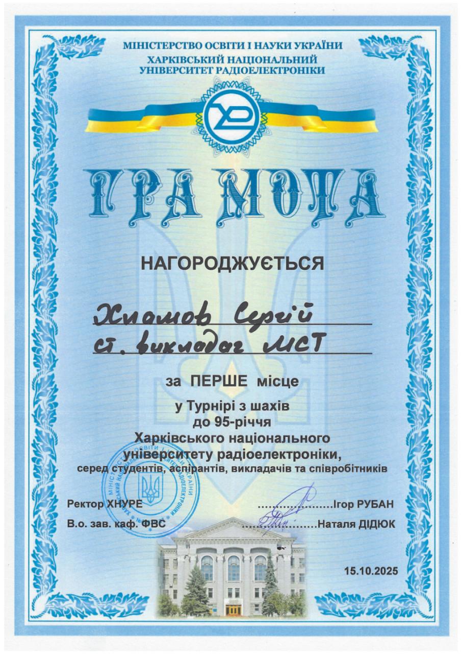 Ми пишаємось, що в нашому колективі працюють талановиті, цілеспрямовані й багатогранні особистості. Недарма кажуть: талановита людина — талановита в усьому! Сергій активно займається науковою діяльністю, має потужну публікаційну активність, наполегливо працює над докторською дисертацією — і водночас знаходить час для свого улюбленого інтелектуального захоплення — шахів.
